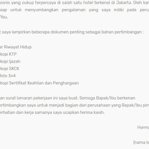 Berdasarkan iklan lowongan pekerjaan di harian medan edisi 5 januari 2021 dengan posisi marketing, melalui surat ini saya bermaksud melamar pekerjaan di pt sedia grup dengan posisi tersebut. Dengan ini mengajukan surat lamaran pekerjaan kepada bapak / ibu pimpinan untuk diterima menjadi karyawan di perusahaan yang kepada yth, kepala bagian personalia aston bali resort & spa jl. Berikut adalah beberapa contoh surat lamaran kerja di hotel yang bisa anda jadikan sebagai bahan referensi. Contoh surat lamaran kerja / pekerjaan terbaru di perusahaan, pt bank, fresh graduate, bahasa inggris, cpns 1 contoh surat lamaran pekerjaan yang baik dan benar. Berikut contoh surat lamaran pekerjaan yang bisa kamu download file dokumennya juga, link di bagian akhir artikel.